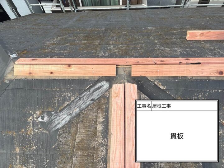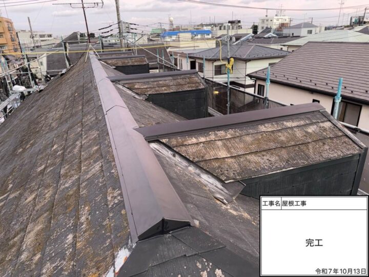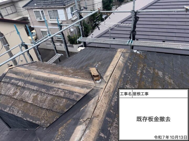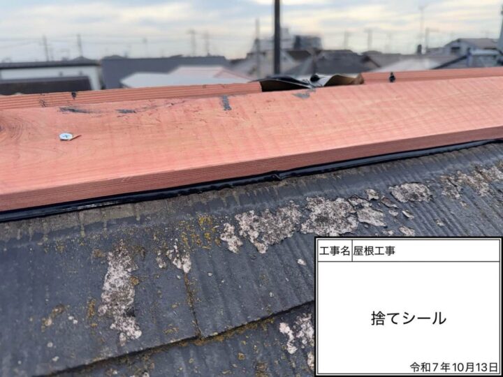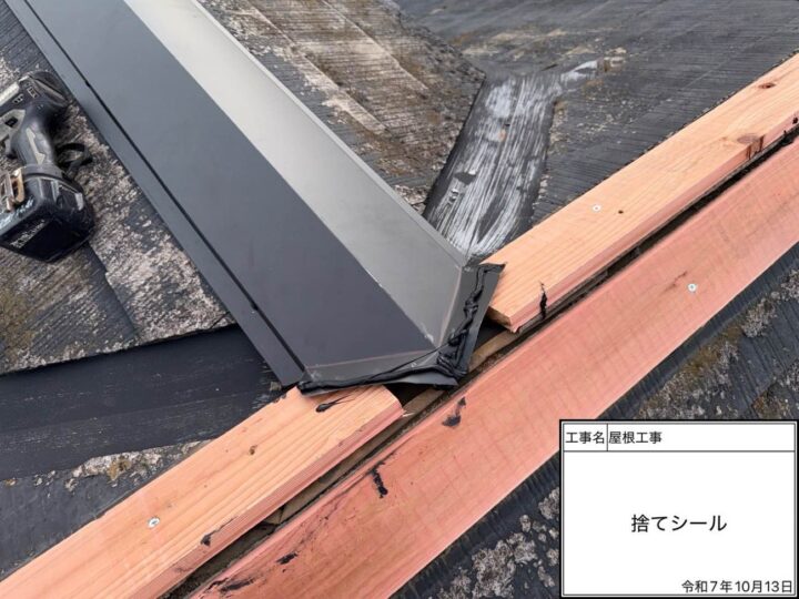 既存の古い棟板金を取り外します。撤去した棟板金を再利用することはできませんので、新しい棟板金を取付けます。 -