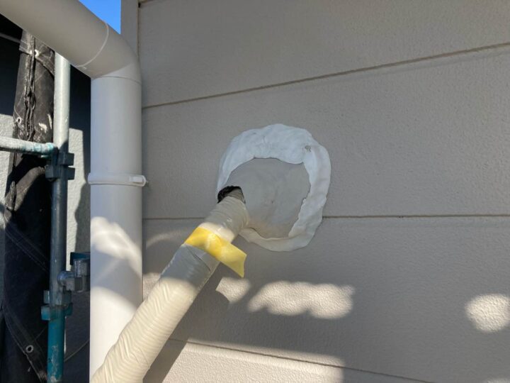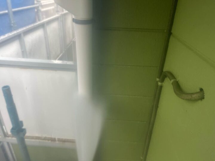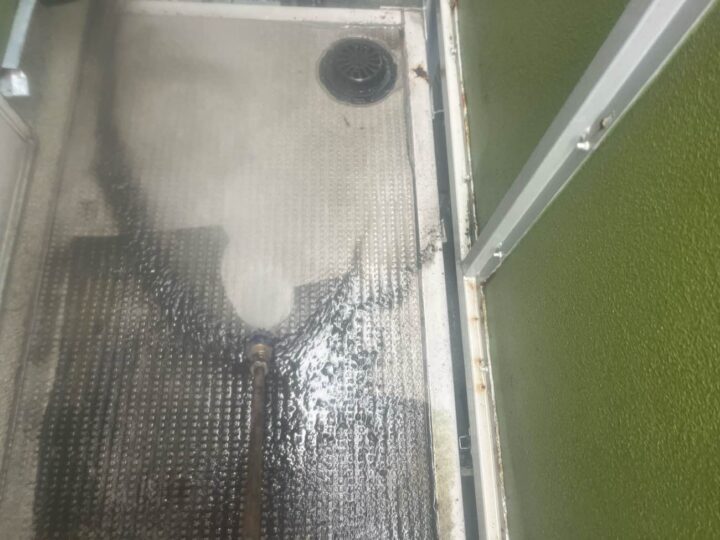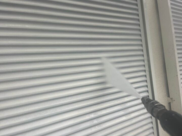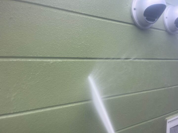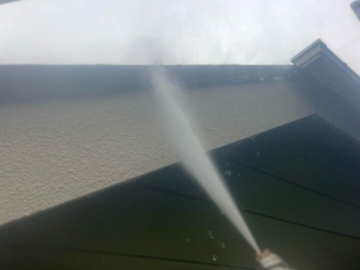 塗料の密着性を高める為、外壁に付いた長年の汚れやホコリなどを業務用の高圧洗浄機にて洗浄いたします。 -
