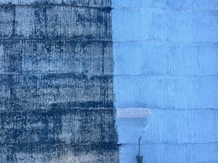 屋根は経年劣化により、屋根材がボソボソになってしまっており、1回の下塗りは吸い込まれてしまいます。 上塗り塗料の耐久性を保つために、下塗りを2回塗布し、しっかりと塗膜を形成させます。 -