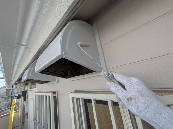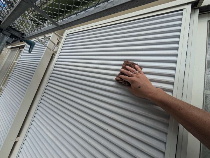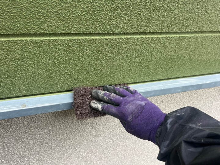 スチール製の付帯部は、塗料の密着性を高める為、ケレンという軽くキズを付ける作業が重要です -