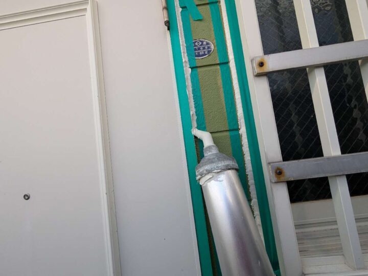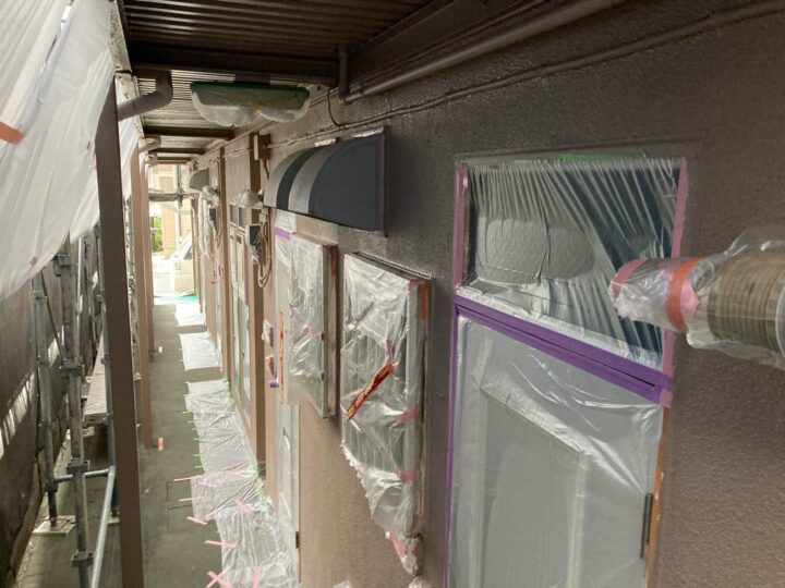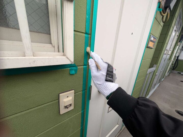 窓やアルミサッシなど、塗装しない箇所に塗料が付着しないよう、養生していきます。 -