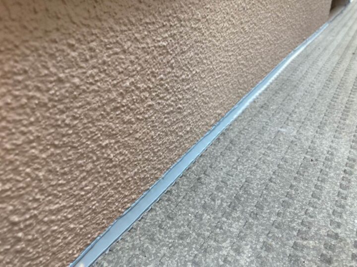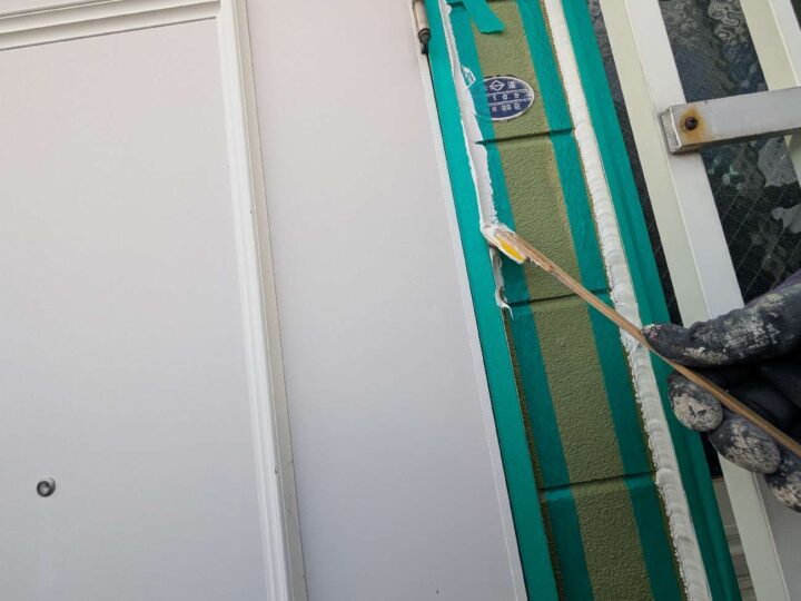 シーリング材打設の前に専用プライマーを塗布し、外壁材とシーリング材の付着性をよくします。 又、3面接着を回避するため2面にのみ塗布しています。 -