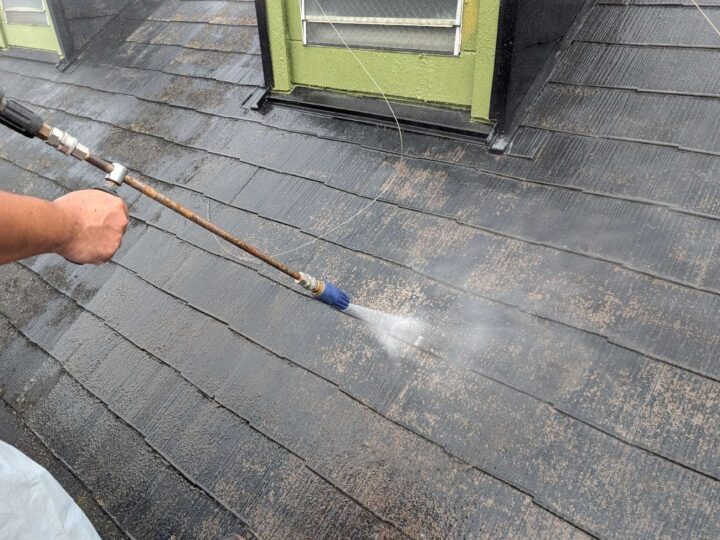 業務用の高圧洗浄機を使い、屋根を洗浄していきます。 外壁や屋根に付いた汚れなどを水圧で洗い流し、塗料の密着性を良くします。 -