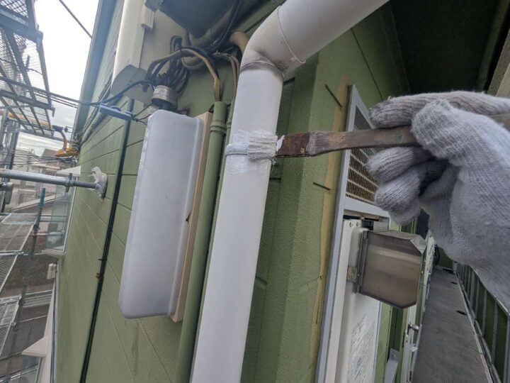 ケレン後に、雨樋の留め具に、鉄部用のサビ止め塗料を塗布いたします。 -