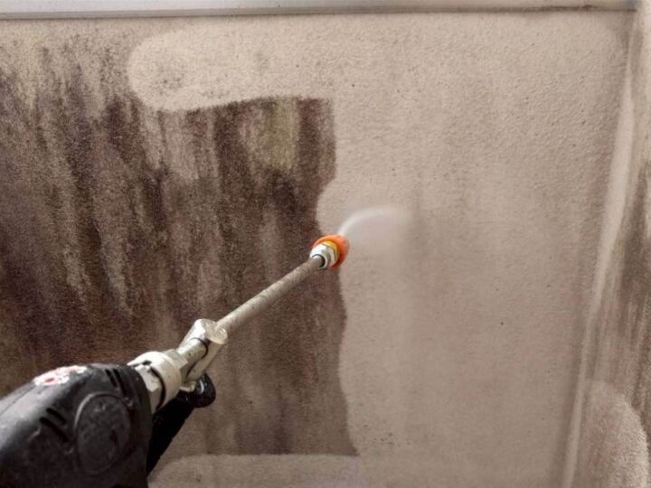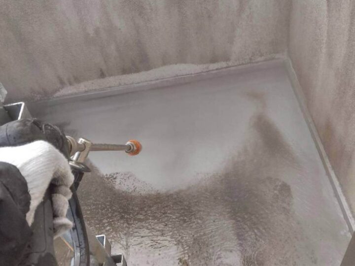 塗料の密着性を高める為、外壁に付いた長年の汚れやホコリなどを業務用の高圧洗浄機にて洗浄いたします。 -