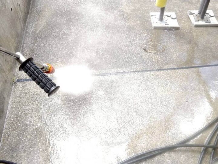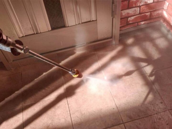 高圧洗浄の際、塗装する屋根や外壁だけではなく、駐車場床の土間なども高圧洗浄いたします。 -