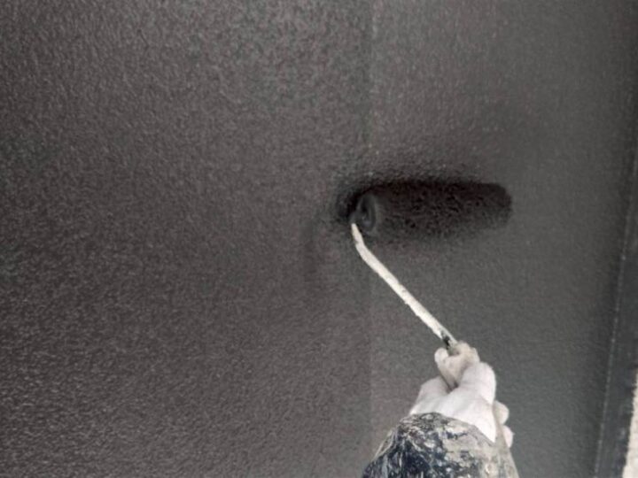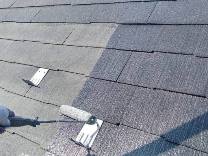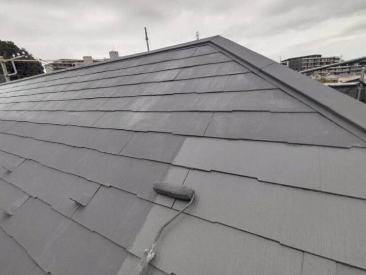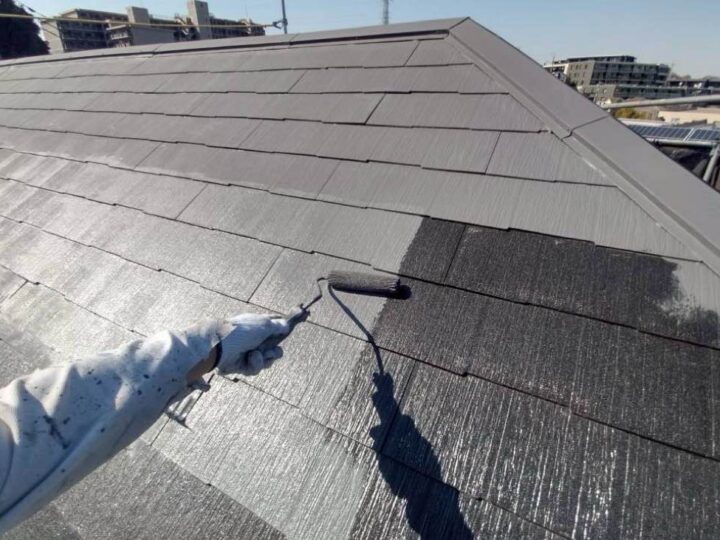 屋根の上塗り2回目の行っております。 上塗り塗料を2回塗ることにより、塗料の耐久性を発揮します。 -