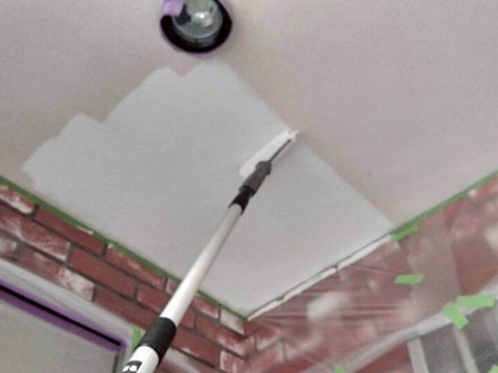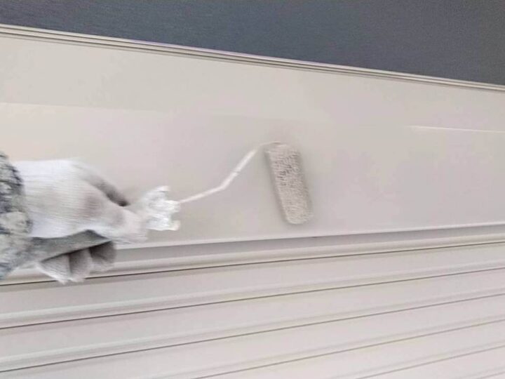 透湿性・防カビ性に優れた軒天井専用塗料にて、上塗り1回目を塗布しております。 -