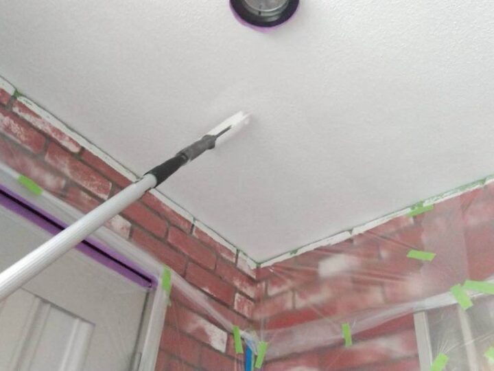 透湿性・防カビ性に優れた軒天井専用塗料にて、上塗り2回目を塗布しております。 -