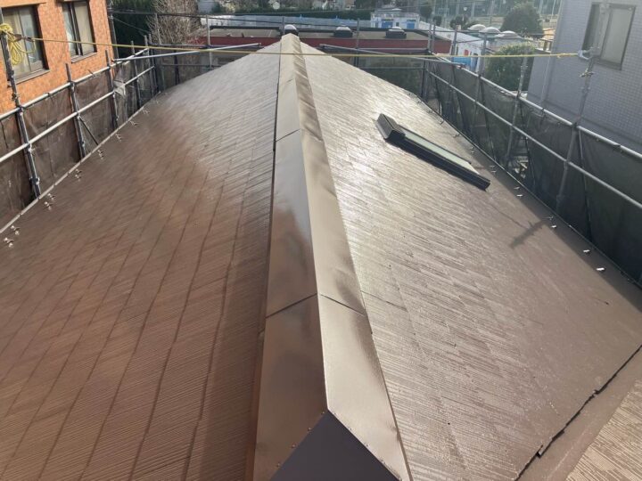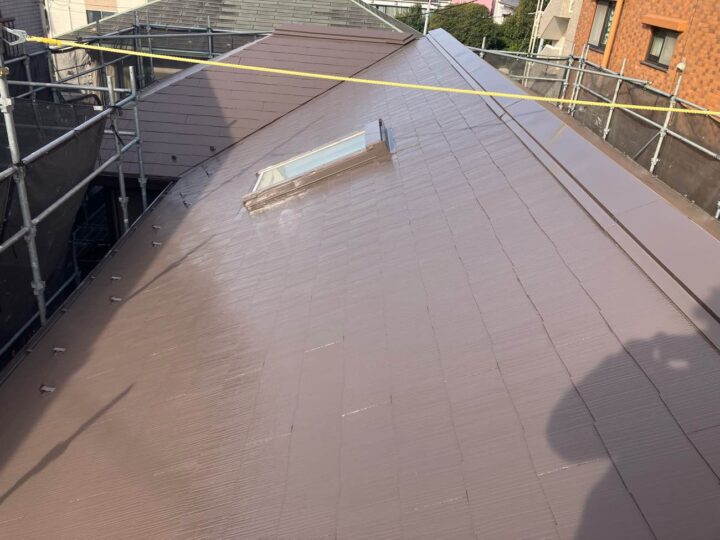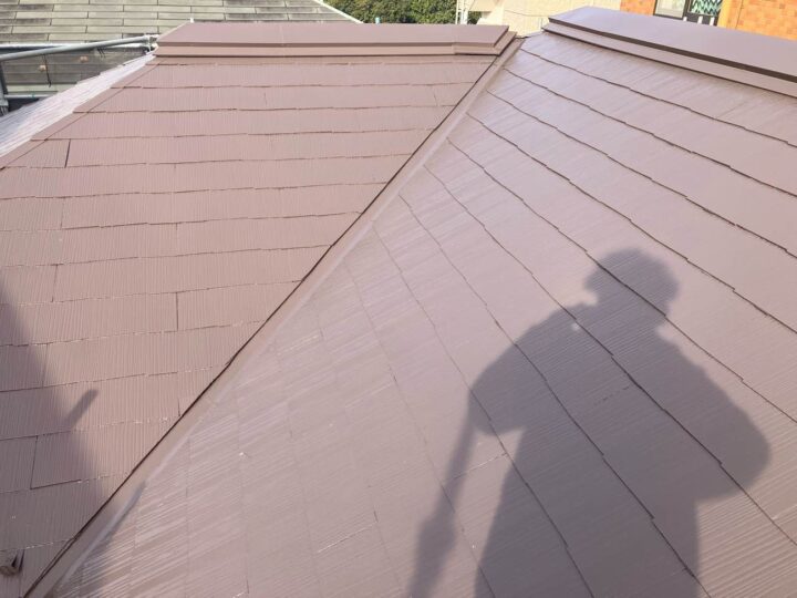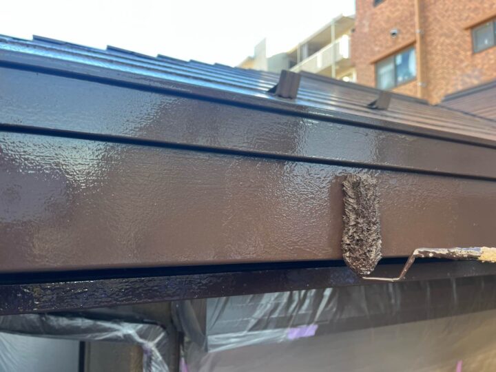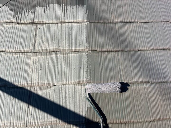 屋根の上塗り2回目の行っております。 上塗り塗料を2回塗ることにより、塗料の耐久性を発揮します。 -