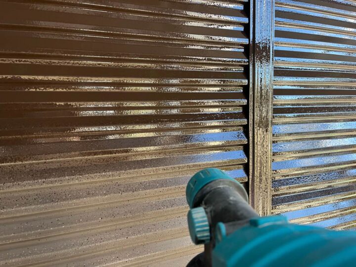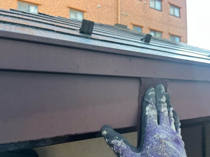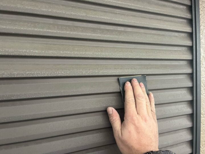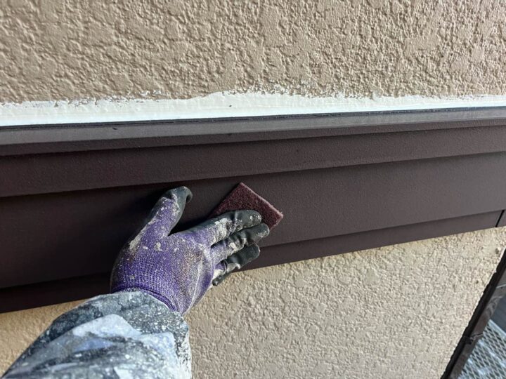 スチール製の付帯部は、塗料の密着性を高める為、ケレンという軽くキズを付ける作業が重要です。 -