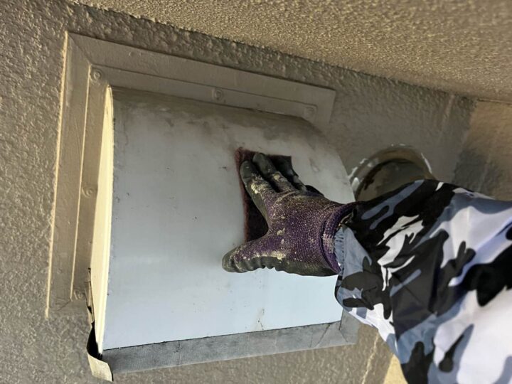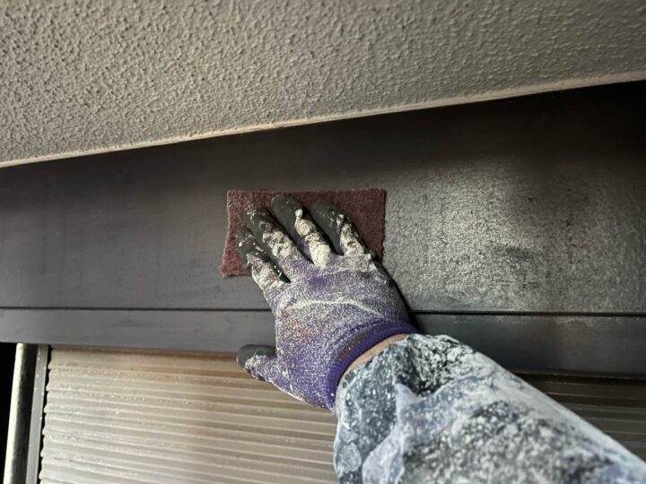 スチール製の付帯部は、塗料の密着性を高める為、ケレンという軽くキズを付ける作業が重要です -