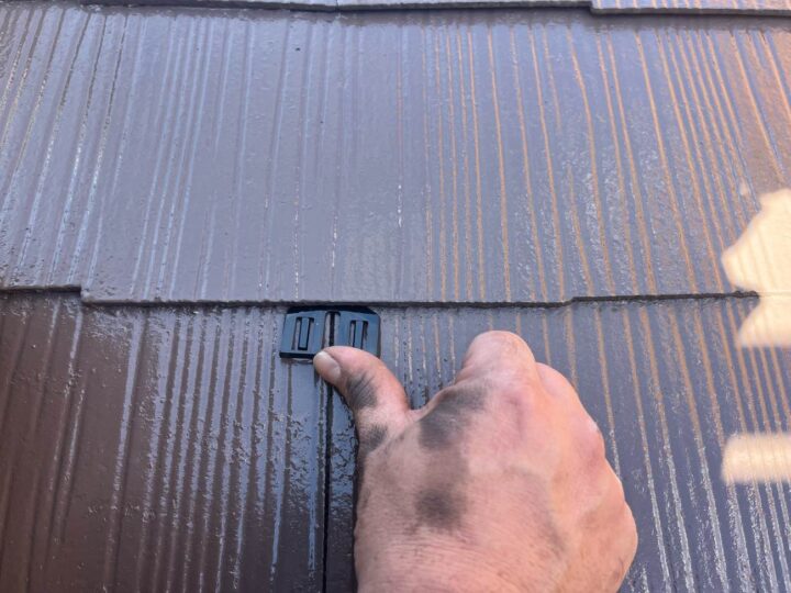 屋根材と屋根材の隙間を確保するため、「タスペーサー」という専用の部材を差し込みます。 屋根材の隙間を埋めてしまうと、狭いところに吸い上げられる「毛細管現象」という水の特性で、屋根の裏側に雨水が回り込み、雨漏りの原因となってしまいます。 -
