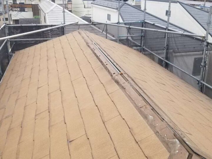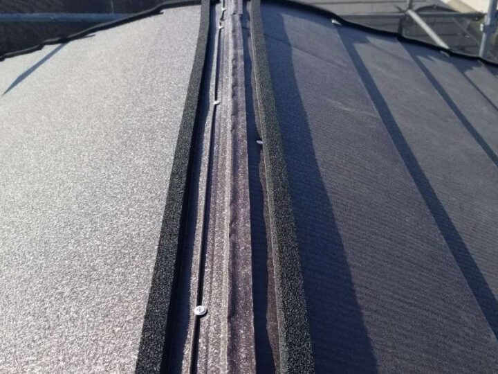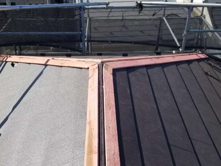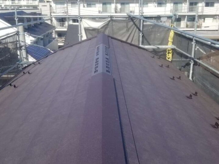 屋根カバー工法では、既存の古い棟板金を取り外します。撤去した棟板金を再利用することはできませんので、新しい棟板金を取付けいたします。 -