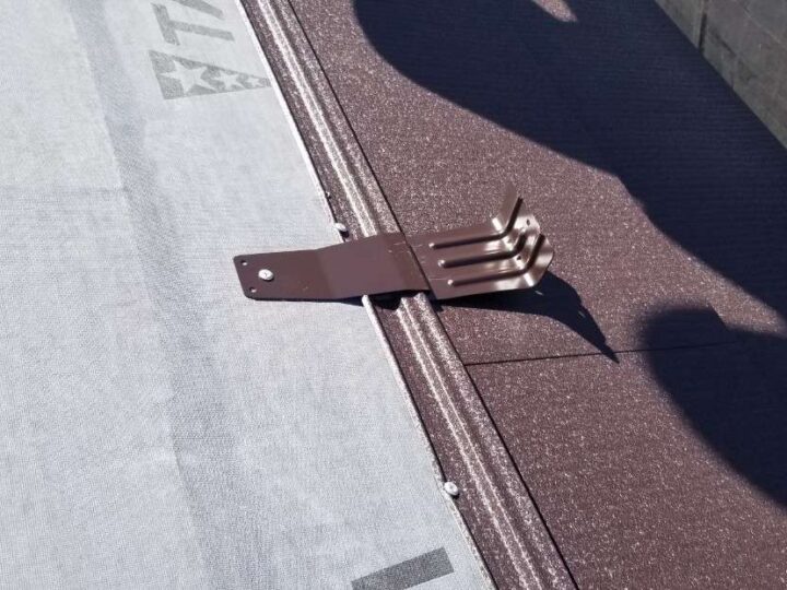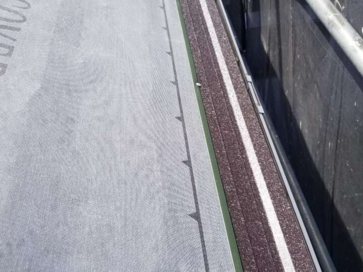 屋根の外周に幅10cmから20cm程度の板金部材を取り付けます。軒先唐草(のきさきからくさ)やケラバ水切りとよばれる板金部材です。 -