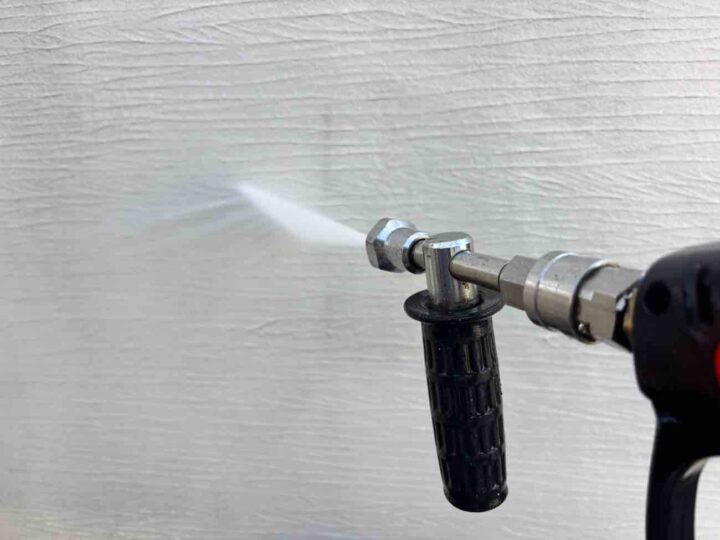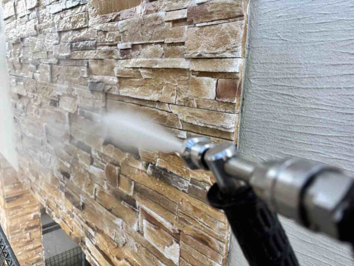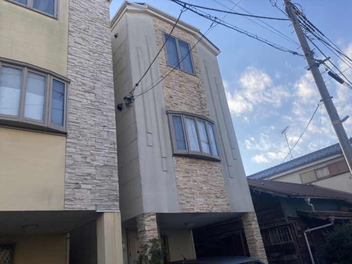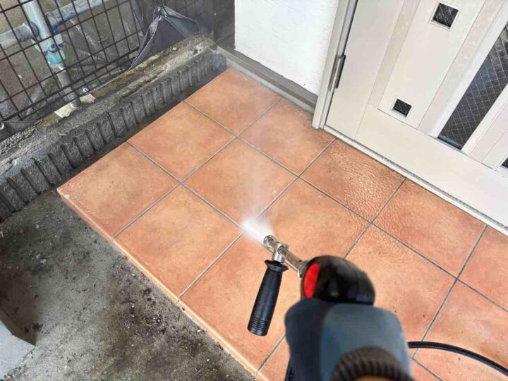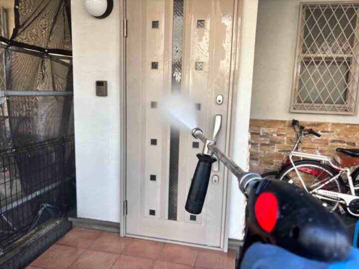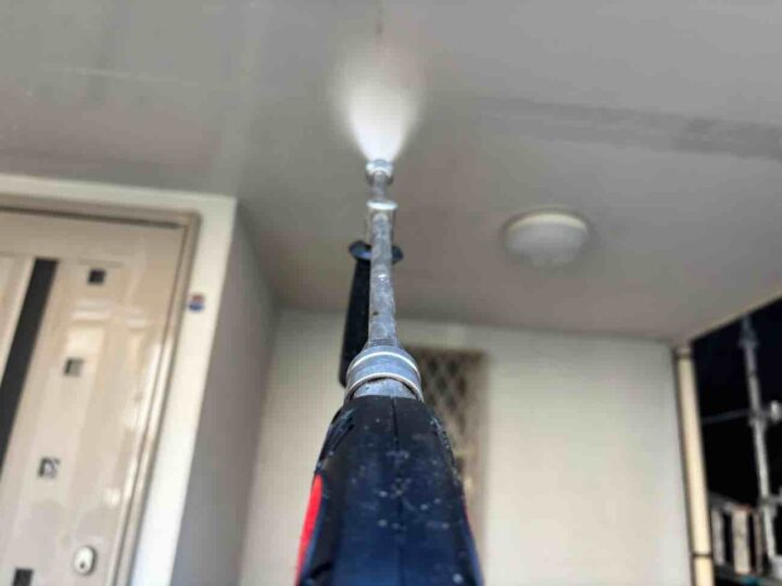 塗料の密着性を高める為、外壁に付いた長年の汚れやホコリなどを業務用の高圧洗浄機にて洗浄いたします。 -
