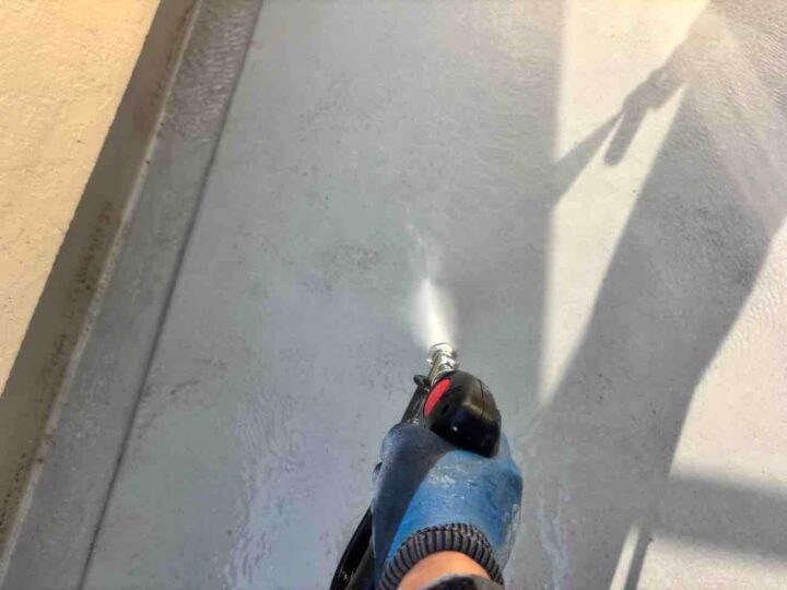 高圧洗浄の際、塗装する屋根や外壁だけではなく、駐車場床の土間なども高圧洗浄いたします。 -