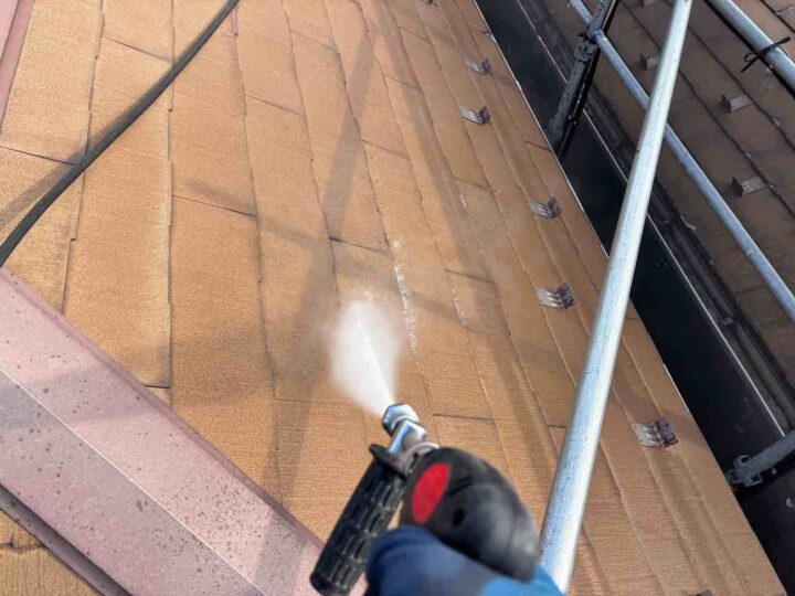 業務用の高圧洗浄機を使い、屋根を洗浄していきます。 外壁や屋根に付いた汚れなどを水圧で洗い流し、塗料の密着性を良くします。 -
