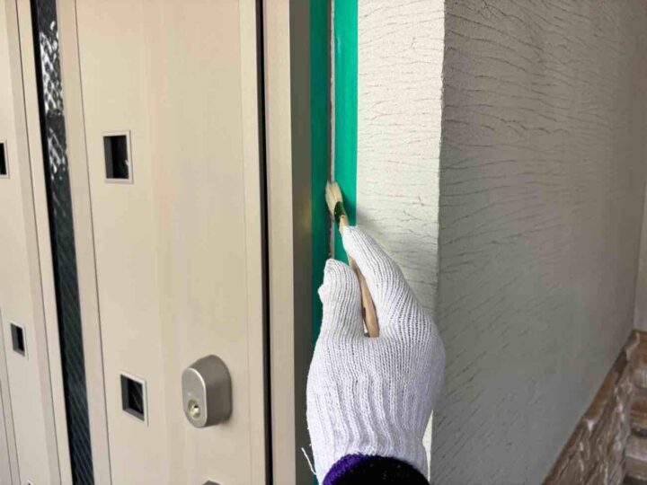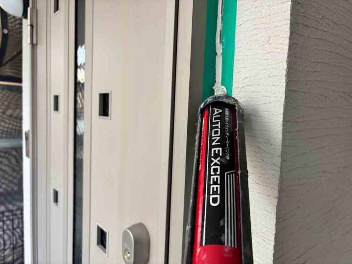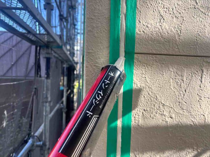 シーリング材打設の前に専用プライマーを塗布し、外壁材とシーリング材の付着性をよくします。 又、3面接着を回避するため2面にのみ塗布しています。 -