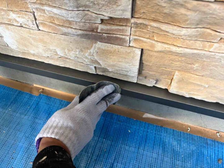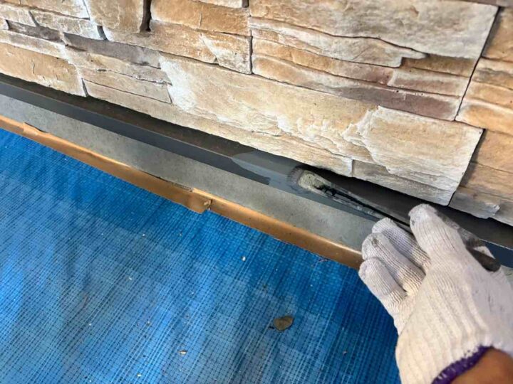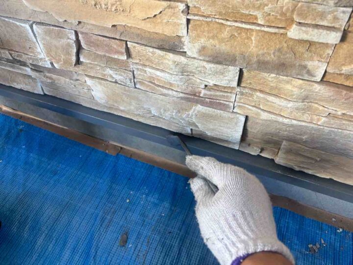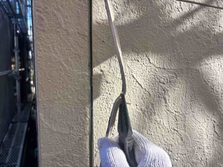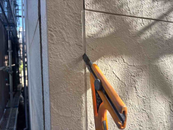 カッターなど専用工具を使用し既存のシーリング材を撤去しています。 -