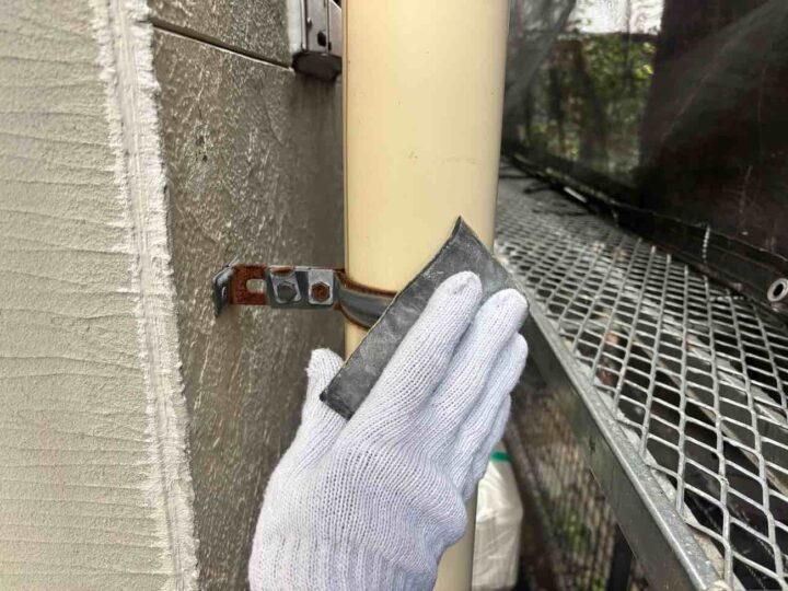 ケレン後に、雨樋の留め具に、鉄部用のサビ止め塗料を塗布いたします。 -