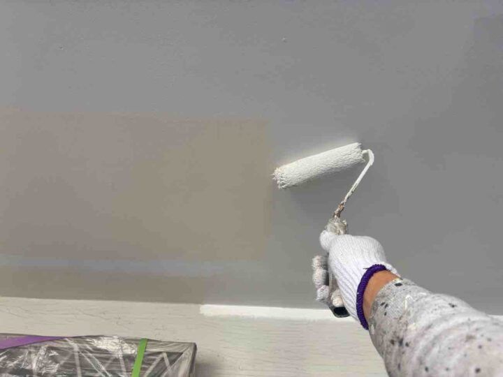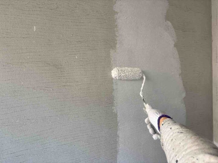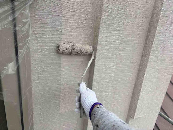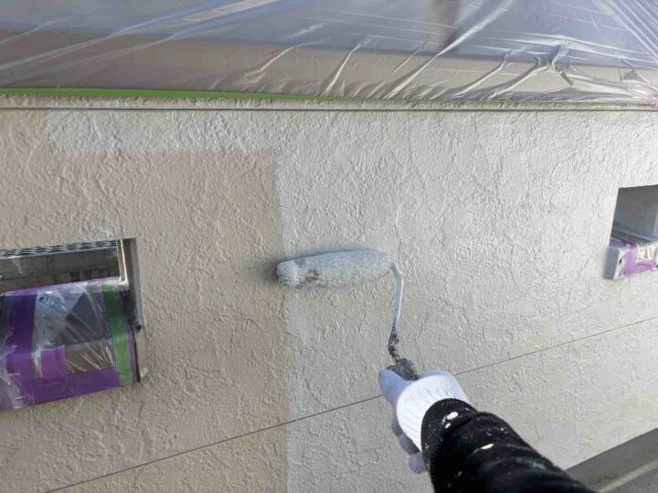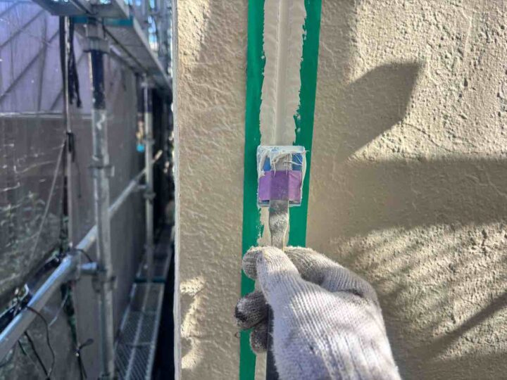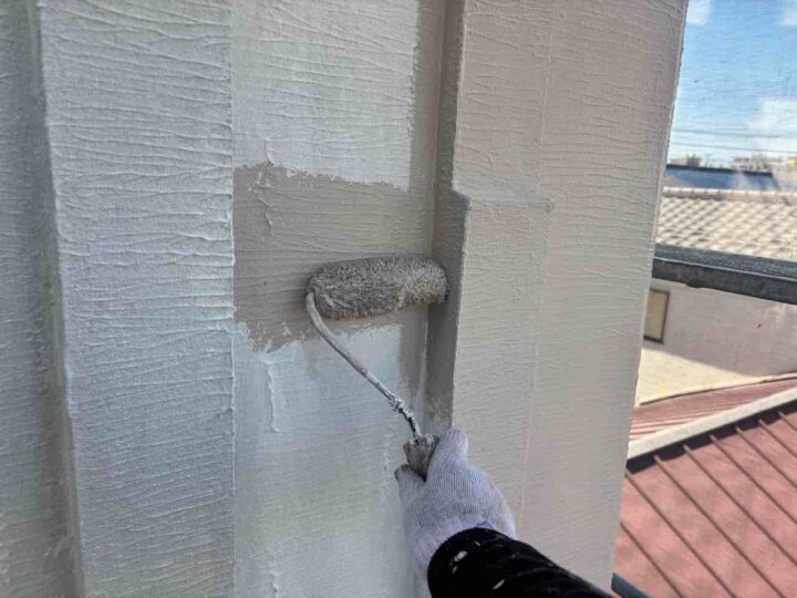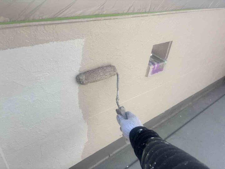 「微弾性フィラー」と呼ばれる、弾力性があり細かなひび割れなどを埋めてくれる下塗り材を塗布いたします。 -