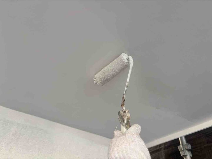 透湿性・防カビ性に優れた軒天井専用塗料にて、上塗り2回目を塗布しております。 -