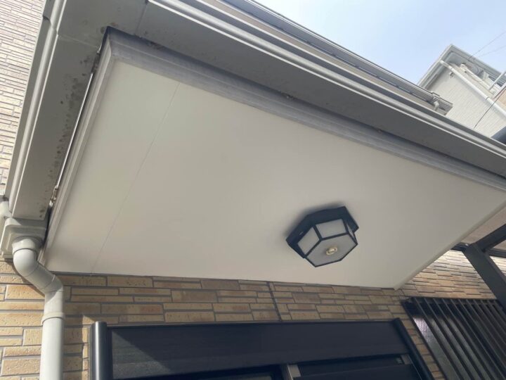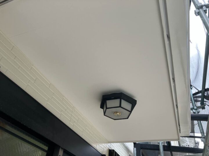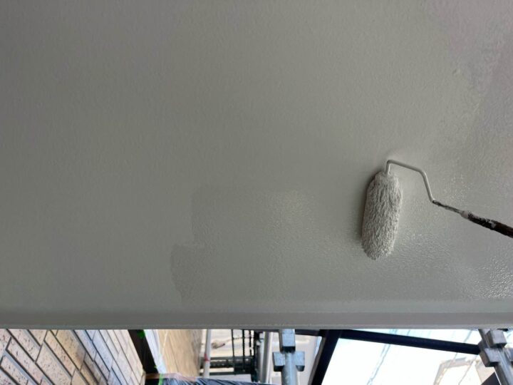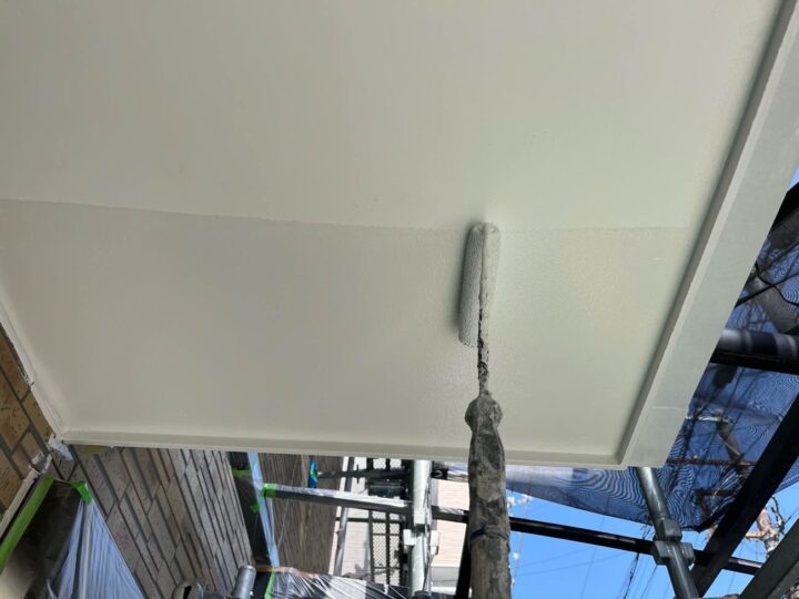 透湿性・防カビ性に優れた軒天井専用塗料にて、上塗り1回目を塗布しております。 -