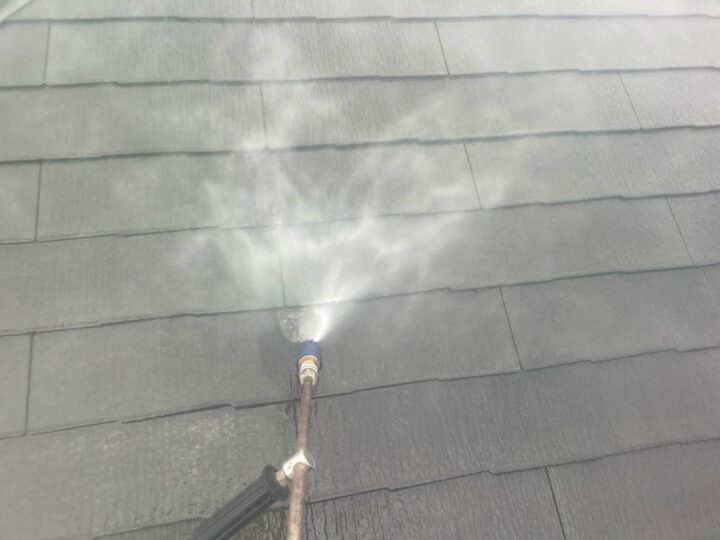 業務用の高圧洗浄機を使い、屋根を洗浄していきます。 外壁や屋根に付いた汚れなどを水圧で洗い流し、塗料の密着性を良くします。 -