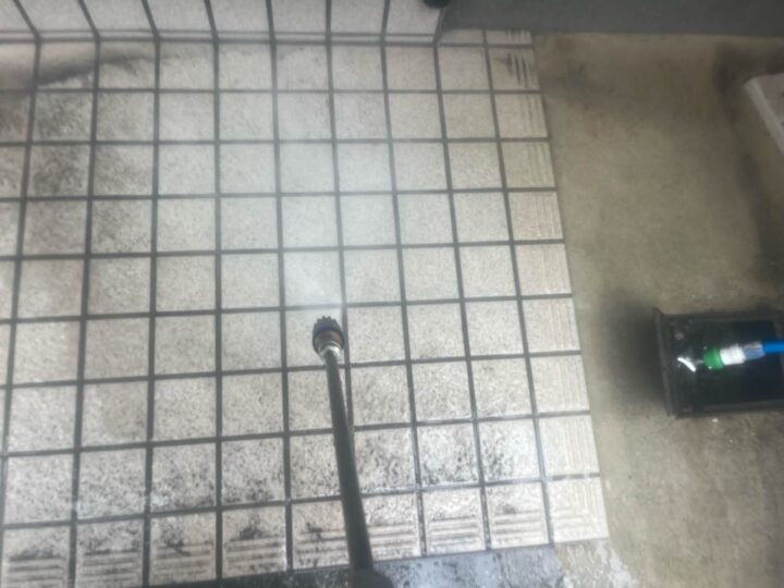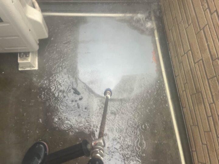 高圧洗浄の際、塗装する屋根や外壁だけではなく、駐車場床の土間なども高圧洗浄いたします。 -