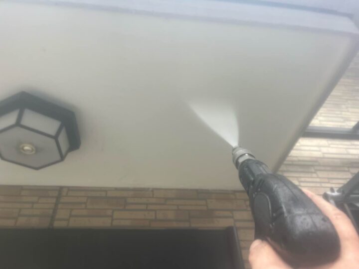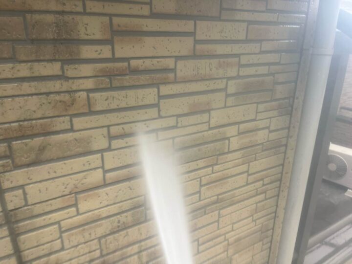 塗料の密着性を高める為、外壁に付いた長年の汚れやホコリなどを業務用の高圧洗浄機にて洗浄いたします。 -