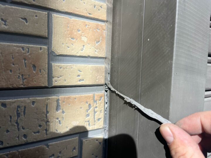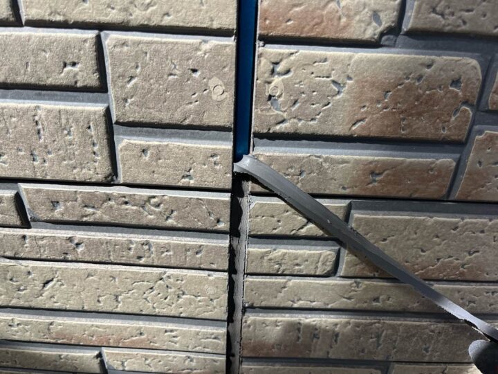 カッターなど専用工具を使用し既存のシーリング材を撤去しています。 -