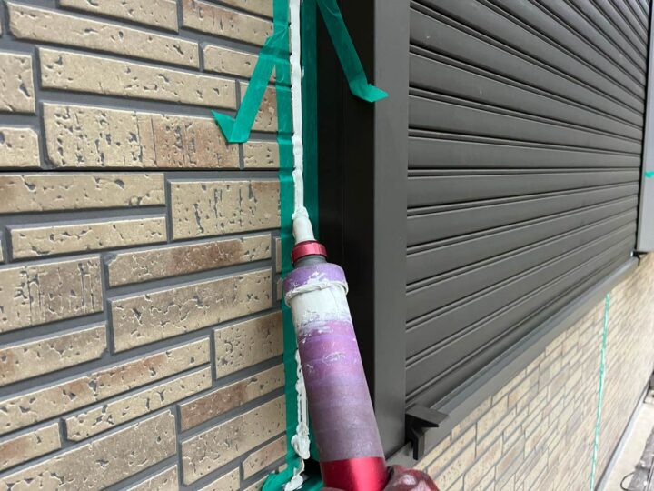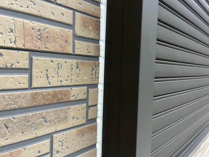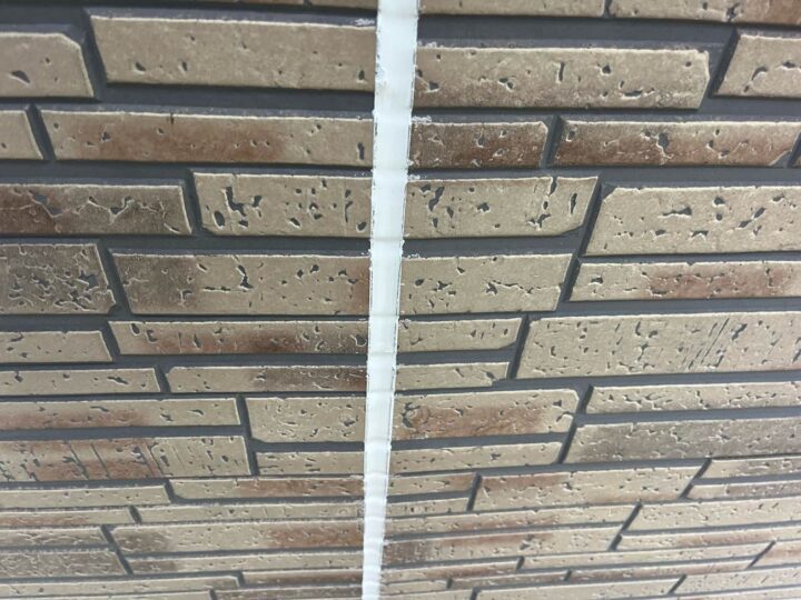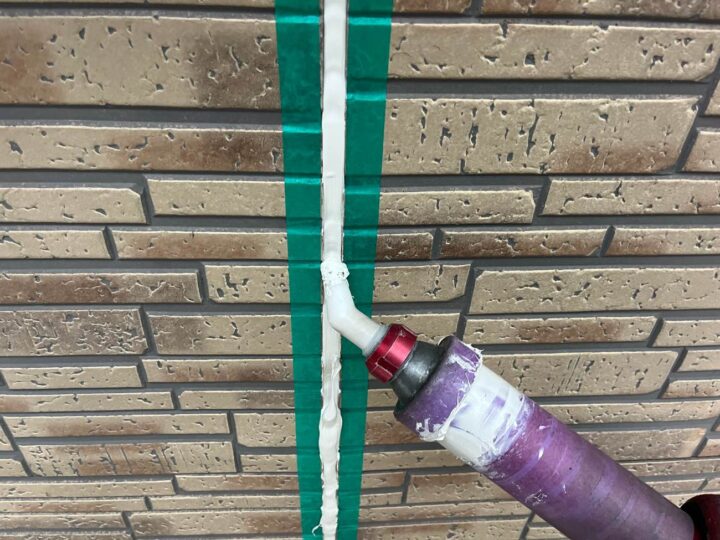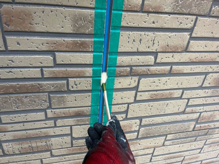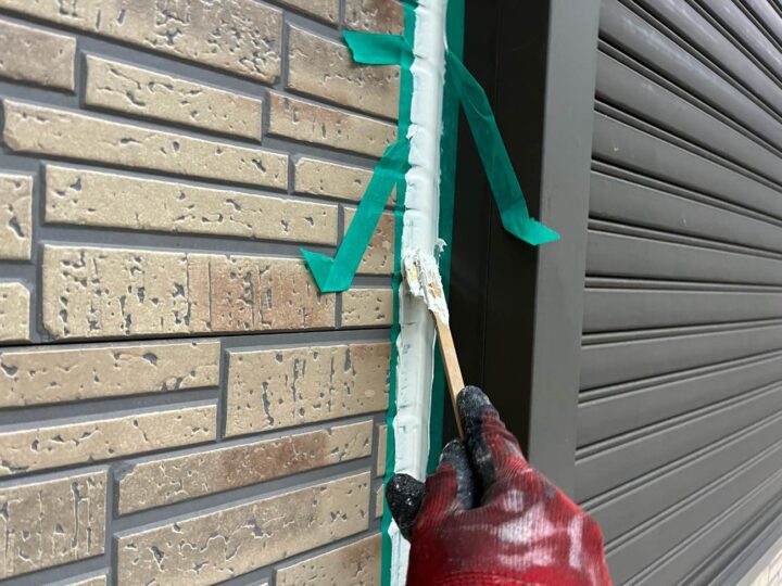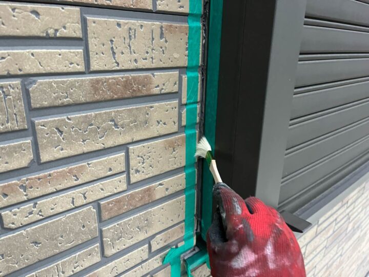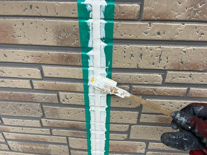 シーリング材打設の前に専用プライマーを塗布し、外壁材とシーリング材の付着性をよくします。 又、3面接着を回避するため2面にのみ塗布しています。 -