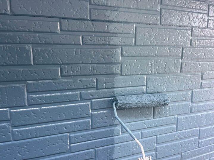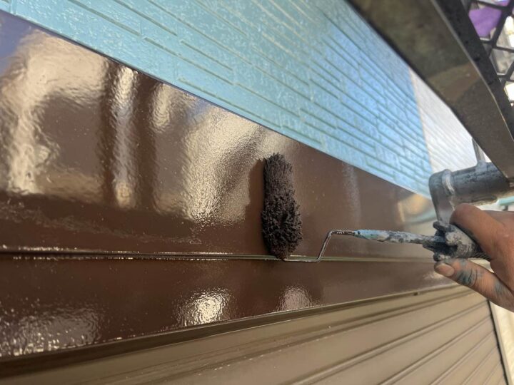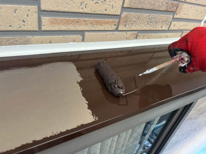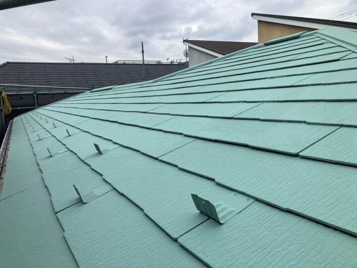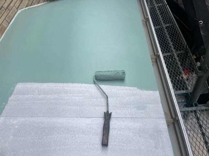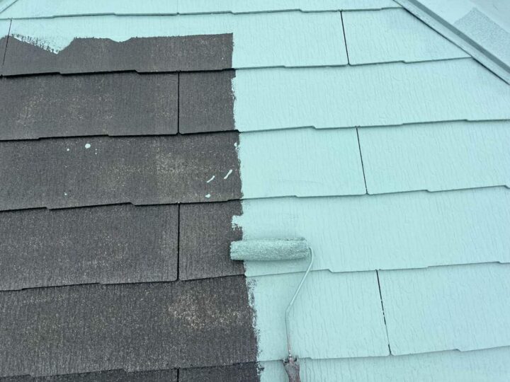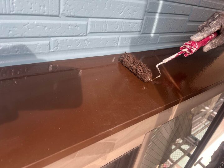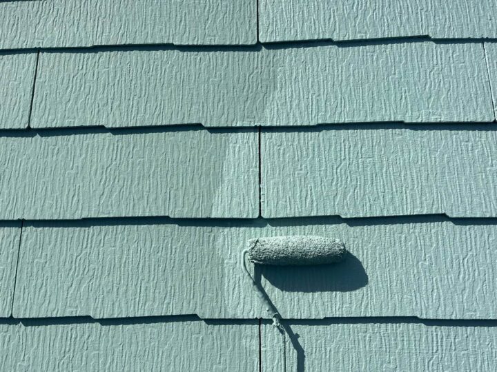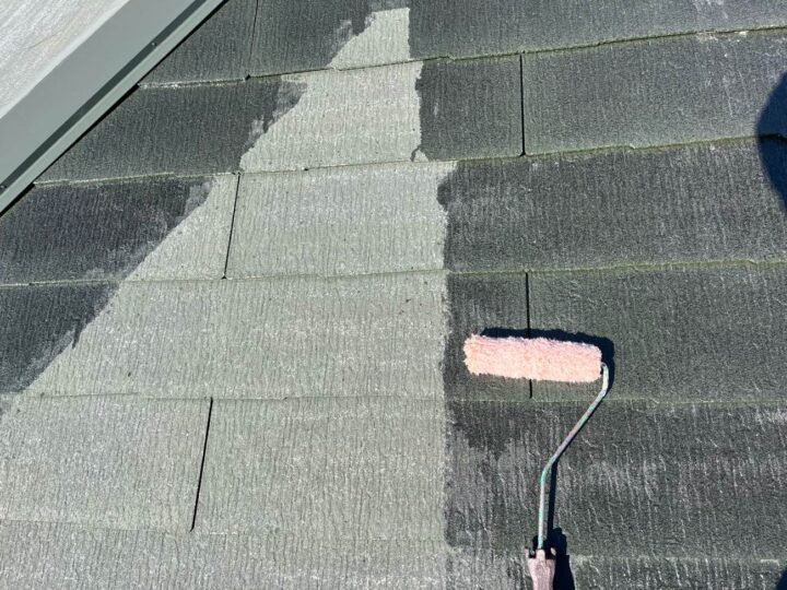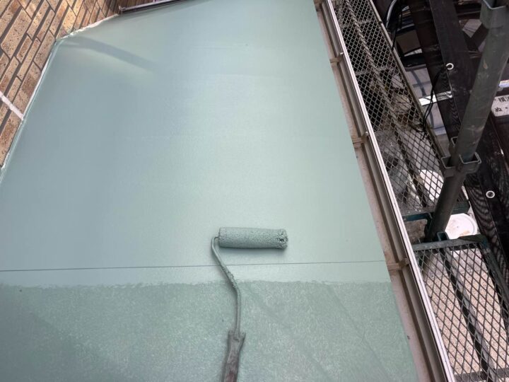 屋根の上塗り2回目の行っております。 上塗り塗料を2回塗ることにより、塗料の耐久性を発揮します。 -